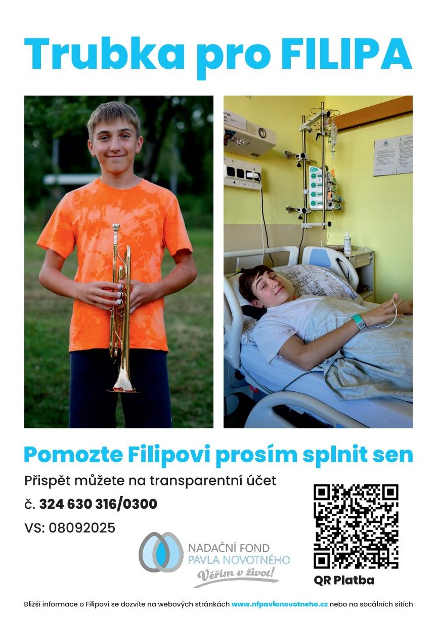 Filip by si moc přál mít svou vlastní trubku, na kterou by mohl hrát i během léčby, pokud mu to zdravotní stav dovolí. Cena nové trubky s příslušenstvím je kolem 20 000 Kč.